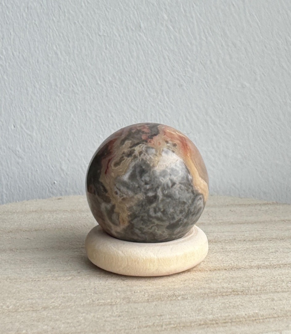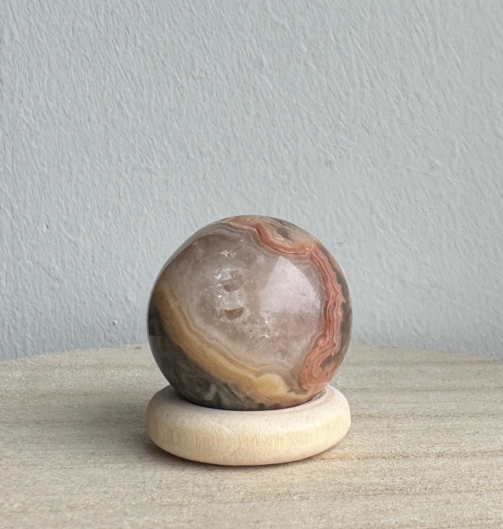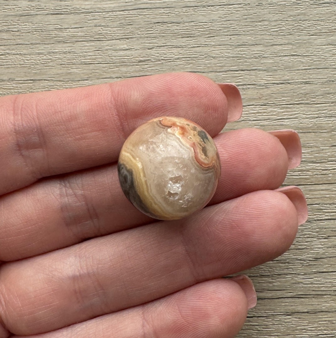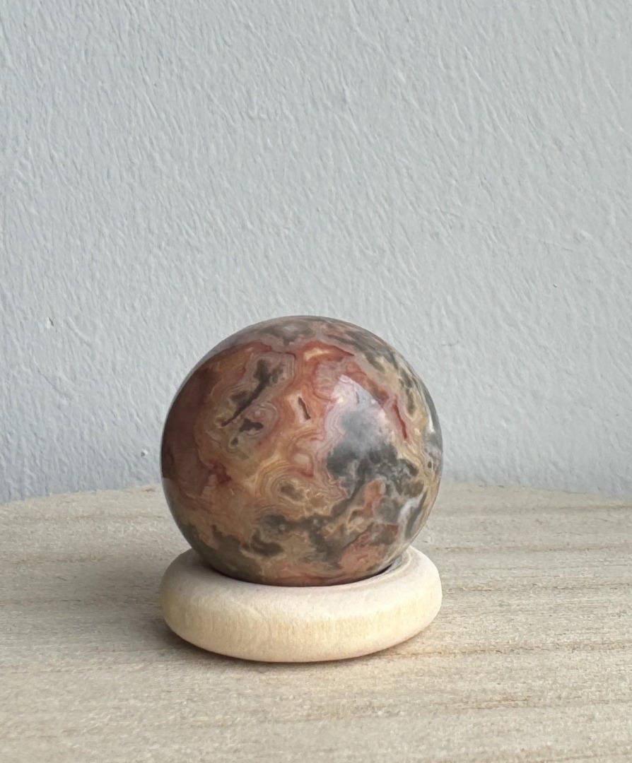 Kleine crazy lace agaat bol. De bol heeft hele mooie belijningen en een kleine "druzy" pocket. Wordt geleverd met kleine houten ring.